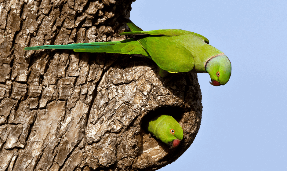The echo parakeet, or Mauritius parakeet (Psittacula eques), is a vibrant, endemic parrot to Mauritius and is the last remaining species of Mascarene island parrots. Once critically endangered, this emerald green parrot is close both physically and in DNA to the rose-ringed parakeet, but boasts a lower-pitched call, shorter tail and deeper green coloured feathers than the latter, and are much rarer as well, only being found in the Black River Gorges area of Mauritius. The females and males differ in that the males have a marking that looks like a neck collar that the females don’t possess and red upper beaks, where the beak of the female bird is pitch black. This gorgeous parrots can grow up to 36cm in length and live on flowers, leaves and the fruit of both native and exotic plants.