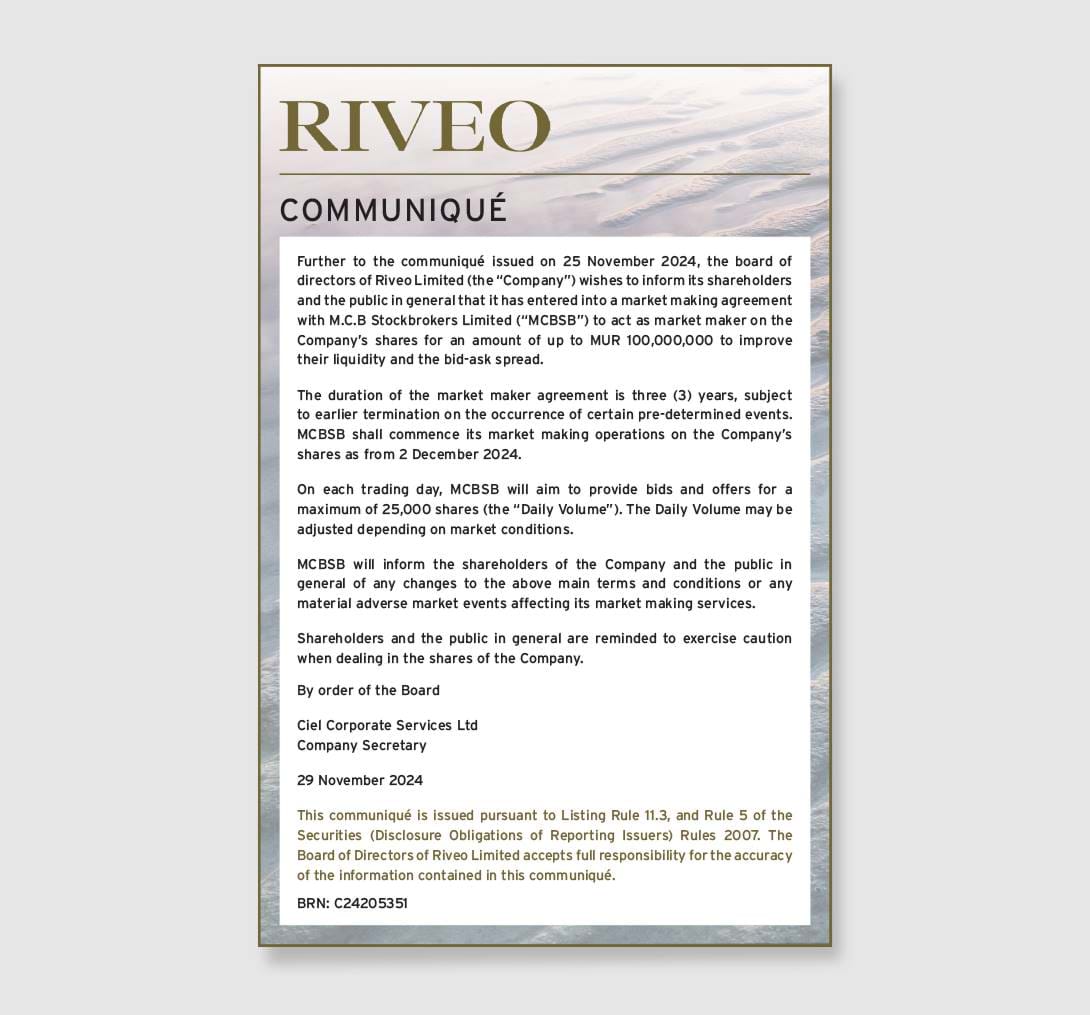 Riveo Limited - Communiqué