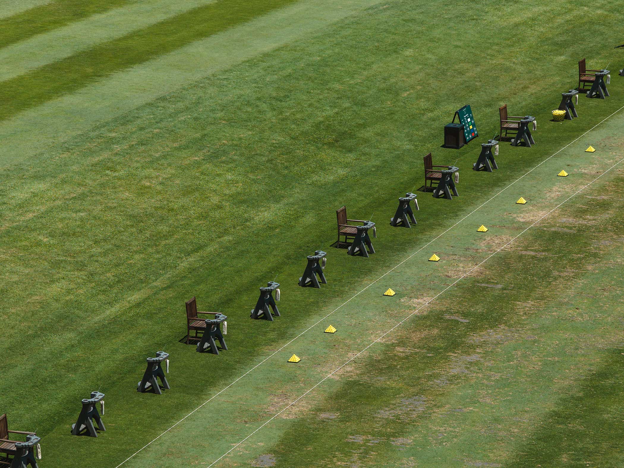 - Practice avec postes sur herbe, structure pour s’abriter du soleil, cibles à différentes distances, balles de practice de qualité et trackman